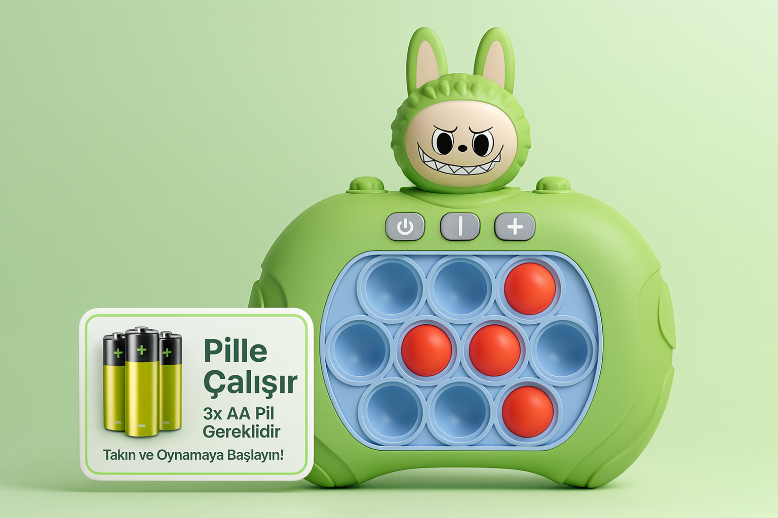 Konsol Pop-It™, klasik pop-it eğlencesini sevimli karakter tasarımları ve farklı oyun modlarıyla birleştirir. Renkli baloncuk yapısı, sesli–ışıklı geri bildirimler ve etkileşimli tuşları sayesinde çocukların el–göz koordinasyonunu ve zihinsel gelişimini destekler.